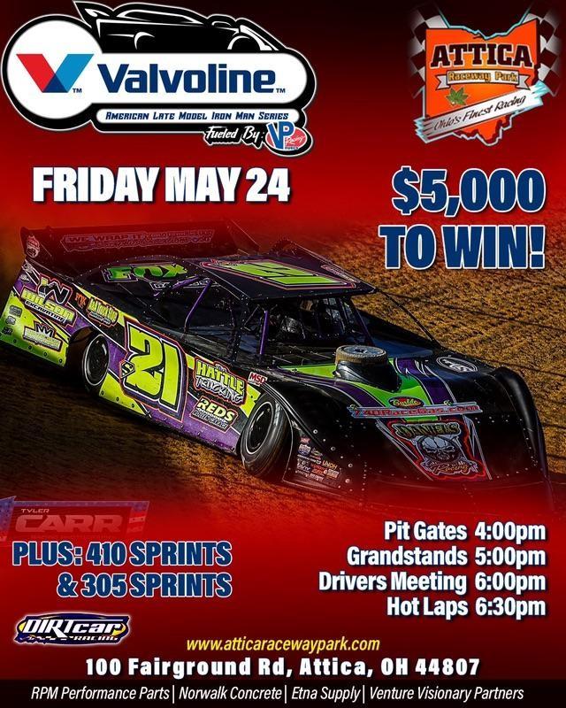 SOMERSET, KENTUCKY (May 19, 2024) – The Valvoline American Late Model Iron-Man Series Fueled by VP Racing Fuels will begin its 2024 racing season and kick off a Memorial Day Weekend tripleheader of racing at Attica Raceway Park in Attica, OH on Friday May 24, racing for $5,000 to win and $500 to start in the main event. The event is presented by RPM Performance Parts, Norwalk Concrete, Etna Supply, and Venture Visionary Partners.
